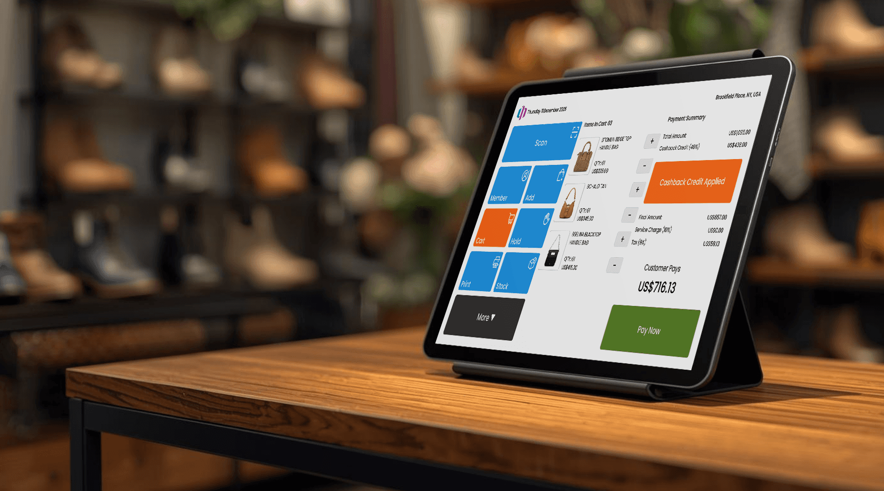 Cashier scans and checks out. Sales milestones are tracked automatically, and cashback credit is issued to prior shoppers when tier targets are hit.