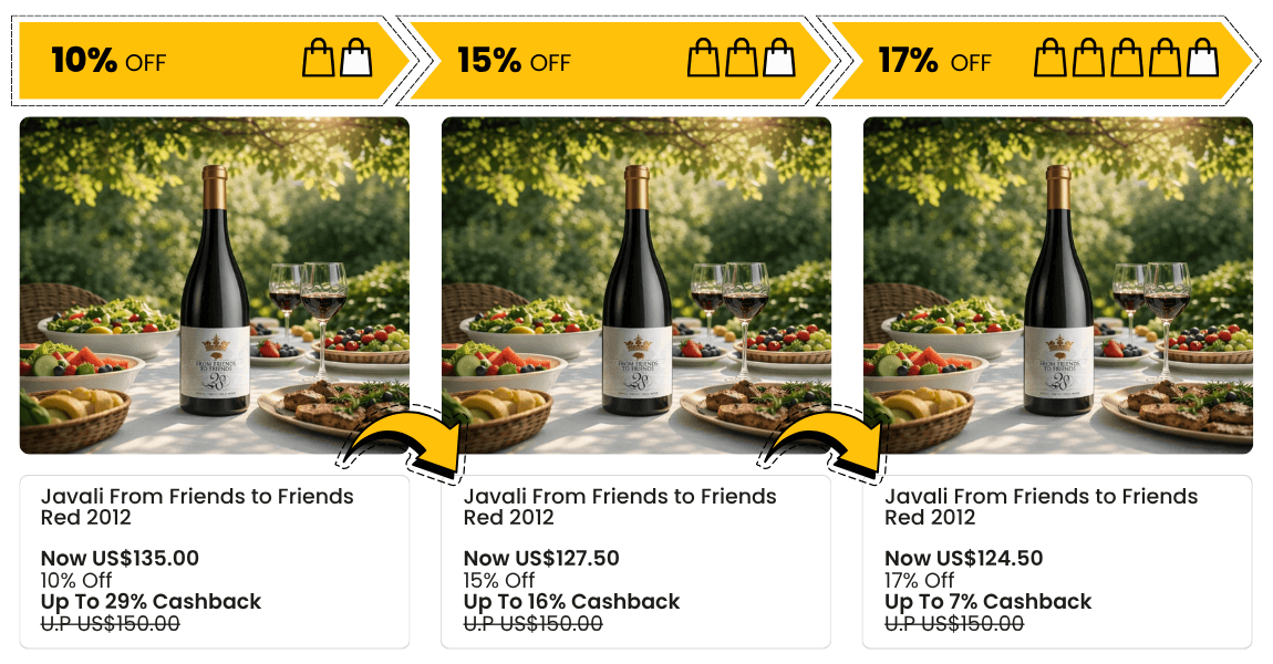 As each sales milestone is hit, the price steps down to the next tier automatically. Shoppers who bought at an earlier, higher price receive cashback credits for the difference. No one feels penalised for buying first. And you never give away margin that the sales numbers have not yet justified.